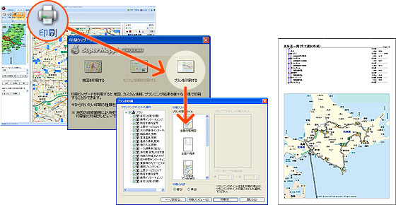 プランニング結果の地図や行程表を印刷することができます。プランの行程とその行程が収まる縮尺の地図が表示されます。また、プランニングポイントだけの印刷も可能です。