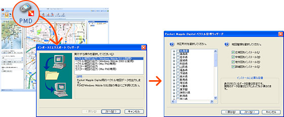 - エクスポートウィザードが起動しますので、出力する地図種類と使用するPDAを選択します。