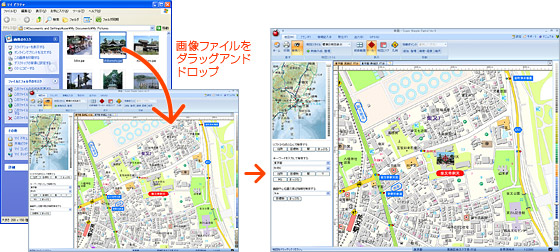 地図上に画像をドラッグアンドドロップすると、地図上にサムネイル画像が作成されます。このとき、画像データが緯度経度情報(GPS IFD)を持ったExif 2.1形式ファイルの場合は、自動で撮影した場所に作成されます。